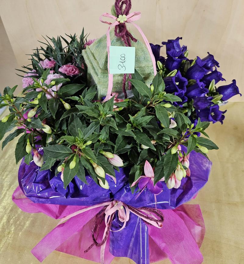 Composizione con pianta di fuxsia, campanula con decorazione pasquale