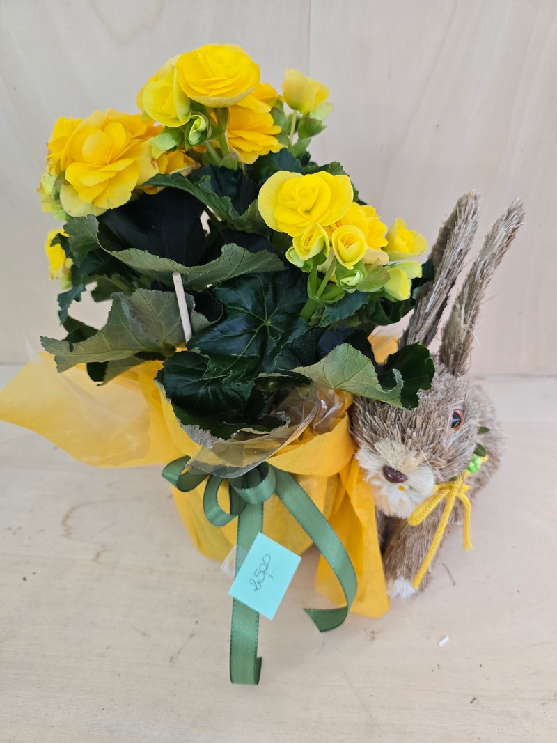Semplice begonia accompagnata da un simpatico coniglio in paglia.