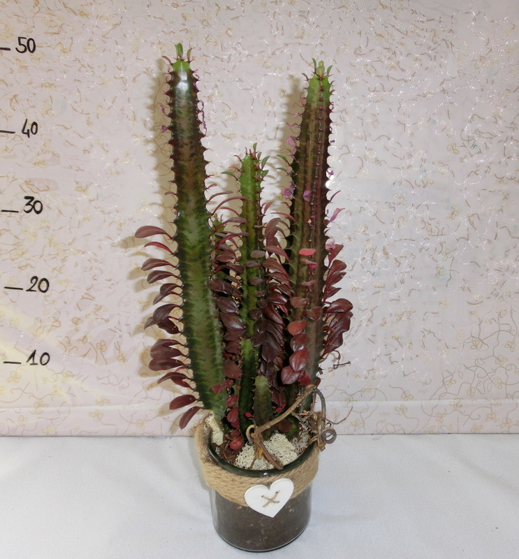 Euforbia trigona con vaso in vetro e decorazione con cuore