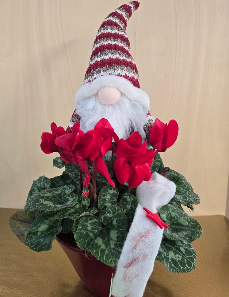 Vaso in ceramica rosso, con ciclamino di media grandezza con gnomo alto circa 40 cm, in armonia di colori.