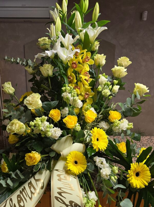 Composizione funebre importante, con colori chiari ed eleganti, possiamo aggiungere una fascia con scritta oppure un biglietto